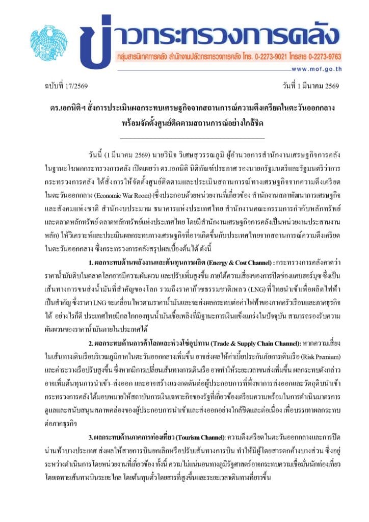 - ข่าวกระทรวงการคลัง ฉบับที่17/2569 วันที่1 มีนาคม 2569 ดร.เอกนิติฯ สั่งการประเมินผลกระทบเศรษฐกิจจากสถานการณ์ความตึงเครียดในตะวันออกกลาง พร้อมจดัต้งัศูนย ์ติดตามสถานการณ์อย่างใกล้ชิด
